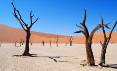 První paprsky východu slunce barví písečné duny do oranžova kontrastující s bledě modrou oblohou a bílými pánvemi Deadvlei, Hiddenvlei, Naravlei, Ostrichvlei a Sossusvlei. Navštívíme tyto kouzelná místa, zaplněná pravěkými kostrami stromů, kde řeka Tsauchab River náhle ukončila svůj tok. Na zpáteční cestě se zastavíme na procházku v hluboce vytvarované erozí rokli, kaňonu Sesriem Canyon. Odpoledne cestujeme pustými vlnitými kopci přes dvě geologicky fascinující údolí, Údolí řeky Gaub River Valley & Údolí řeky Kuiseb River Valley v srdci Národního Parku Namib-Naukluft National Park, který je známý svou rozmanitostí pouštních druhů rostlin a zvěře. Uvidíme žijící fosilii Welwitchia mirabilis a dramatickou Měsíční krajinu Moon Landscape. Po příjezdu do města Swakopmund City, směsi německé architektury a africké atmosféry, si odpočineme u Pobřeží Koster v nejstarším a nejlepším hotelu v Namibii v Hansa Hotel.